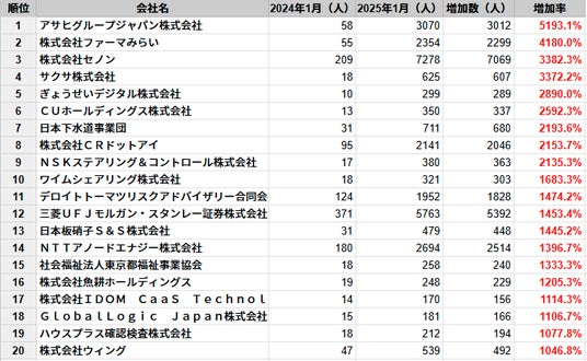 (※増加率=(2025年従業員数 - 2024年従業員数) ÷ 2024年従業員数 × 100)