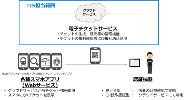 今回、各地域のMaas事業に採用された「交通系電子チケットサービス」は、TISのMaaSプラットフォームが提供している、チケットの生成・販売等の管理機能やチケットの権利確認および権利消込処理などを行えるクラウドサービスです。このサービスと各社のMaaSアプリ(またはWEBサービス)を連携することで、ユーザーは各MaaSからチケットを購入でき、スマートフォンでチケットQRを表示して利用することができます。