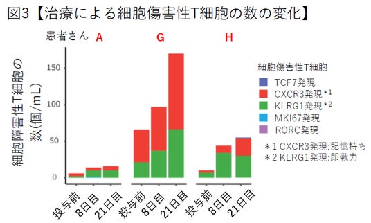 iPS-NKT細胞が投与され、CT画像評価を実施した8名のうち、5名では治験期間中に腫瘍サイズは安定しており、うち2名では腫瘍増大抑制効果を認めました(図2)。腫瘍が著しく大きくなってしまった方と比較して、この2名においてはiPS-NKT細胞のサイトカインによる影響で細胞傷害性T細胞(NKT細胞のはたらきによって増強する免疫細胞の一種)が増加している現象が確認できました(図3)。なお、関連の可能性のある副作用として最も重症な症状はアレルギー反応による皮膚の発疹(薬疹)でした。