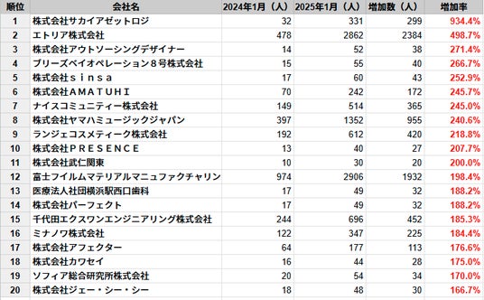 (※増加率=(2025年従業員数 - 2024年従業員数) ÷ 2024年従業員数 × 100)
