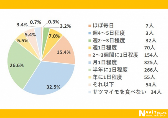 サツマイモを食べる頻度は「月1日程度」が最も多くて、325人。「半年に1日程度」(266人)、「2~3週間に1日程度」(154人)がこれに続いており、好きな人が多いにもかかわらず、食べる頻度はあまり多くないですね。