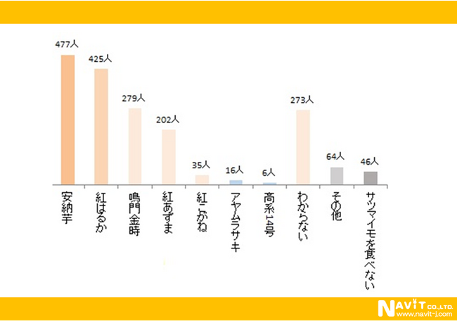 種子島特産の「安納芋」が477人で最多。品種登録が2010年と比較的新しい「紅はるか」(425人)とほぼ拮抗しています。徳島県などが産地の「鳴門金時」(279人)と関東に多い「紅あずま」(202人)を合わせた4品種合計で回答数の75%を占めています。