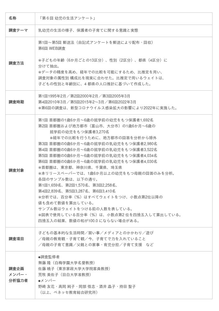 1995年、2000年、2005年、2010年、2015年の実施に続き6回目となる本調査は、少子化や共働き世帯の増加などの社会環境の変化の中で、子どもの生活や、保護者の子育ての実態や意識がどのように変化したのかを、27年間の比較を通して明らかにします。