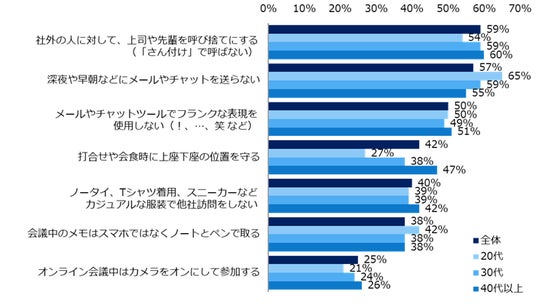 ・仕事の服装は、半ズボンなどでなければスーツである必要性はないと思う。上座・下座についてはマナーとして存在する意味もわかっていない。(20代男性)