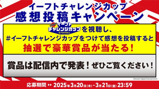 大会を視聴して、生配信の感想を #イーフトチャレンジカップ をつけてXにポストすると、配信中のチャレンジ結果に応じて、豪華賞品が抽選で当たります。賞品の内容は生配信で発表予定ですので、お見逃しなく!