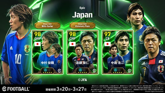 『eFootball(TM)』に、日本を代表するレジェンド選手の中村俊輔、遠藤保仁、中田浩二がEpicとして登場!
