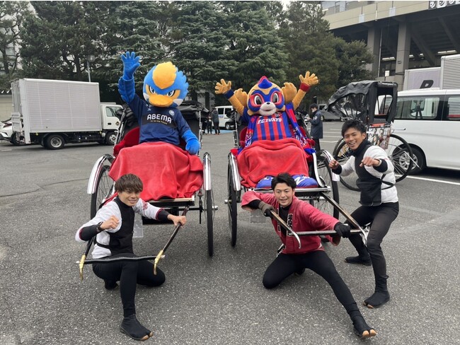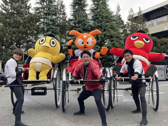 浅草を拠点に活動をしている現役俥夫ユニット”東京力車”が12月17日、秩父宮ラグビー場で行われた『リコーブラックラムズ東京vs 三菱重工相模原ダイナボアーズ戦』、国立代々木競技場第一体育館で行われた『アルバルク東京vs富山グラウジーズ戦』を盛り上げるべく登場した読売巨人軍のマスコット“ジャビット”ら他マスコットを人力車に乗せ、両会場を送迎した。