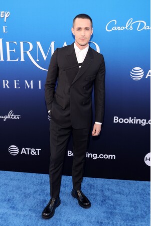 5月8日にロサンゼルスで開催された、実写版『リトル・マーメイド』のプレミアに出席した、ジョナ・ハウアー=キング。キム・ジョーンズによるメンズ コレクションより、ブラックウールのダブルブレストピークドラペルスーツにホワイトコットンシャツとブラックレザーの「ディオール カーロ」ダービーシューズを合わせた装いで登場しました。