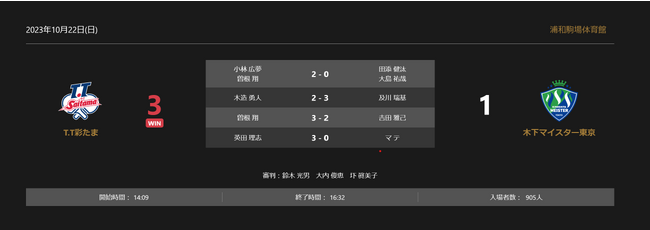 2023-10-23 一般社団法人Tリーグ ノジマTリーグ 2023-2024シーズン 公式戦 10月22日開催 T.T彩たま vs 木下マイスター東京 試合結果 Tweet ノジマTリーグ 2023-2024シーズン 公式戦 10月22日開催の「T.T彩たま vs 木下マイスター東京」の試合は、3-1でT.T彩たまが勝利しました。 企業プレスリリース詳細へ PR TIMESトップへ 公式ツイッター Follow @Straightpress 最新情報をTwitterで受け取ろう! 公式フェイスブックページ 最新情報をFacebookで受け取ろう! 前の記事 一覧へ戻る 次の記事