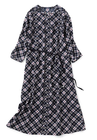 シーズンタータンと無地のコントラストが、スッキリとした印象のシャツドレス。襟の後ろにさりげなく施したN刺繍とDカン付き共地ベルトがポイントです。ハリ感を抑えたフォルムと、ネイビーベースのカラーはコーディネートしやすくワンピースとしてはもちろん、羽織りアイテムとしてもおすすめ。