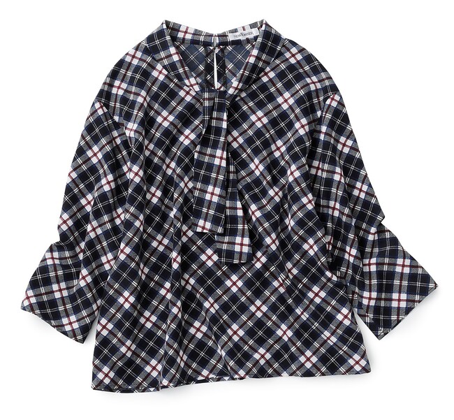 ハウスタータン柄をプリントで表現したブラウス。軽くて柔らかな素材感とバイヤス柄が相まって軽やかな印象を与えてくれます。ショールカラーから繋がるVネックラインのリボンタイは、1枚で着映えるデザインに。サラッとした着心地と広がる袖口なので、涼やかに着用いただけます。