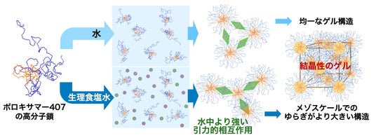 また、高分子ミセル、例えばP407は、結晶相であるゲルを形成する過程において、Alder(アルダー)転移とよばれる乱雑さの相違のみに起因し、非晶質(ゾル)から結晶相(ゲル)への変化を示しますが、関連した基本原理として、この結晶化過程では系を構成する粒子がより整然と整列しつつも粒子周囲の空間が増すことが知られています。本研究において、高分子ミセルのゲル化の過程で、ミセル間が互いに距離を離す挙動が突き止められました。例えば、図2の右図で、生理食塩水中での22℃(青線)から24℃(緑線)の変化において、安定化する位置や緑矢印部分の極小点位置が24℃で遠方にあります。この挙動から理解できることとして、生理食塩水中での脱ゲル化温度の低下があります(図1b)。より強い引力相互作用をミセル間が持つ場合は、ゲル化過程において、結晶化が均一でなくなり密集した凝集状態を残存させ、メゾスケールで観察される構造のゆらぎが生じます。この構造のゆらぎが、ゲルの崩壊を進行させることで、水中より生理食塩水中で、脱ゲル化が低温で生じるとするメカニズムが提案されました(図3)。
