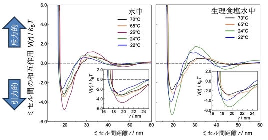 図2:生理食塩水中での高分子ミセル間のゲル化段階やゲルの崩壊過程での相互作用場。横軸はミセル間の距離を示し、縦軸はマイナス方向が引力的な相互作用が強いことを、プラス方向は斥力的な相互作用であることを示す。 (左図) 水中での高分子ミセル間の相互作用場で、22℃、24℃、26℃がゲル化温度より低温でのゲル化段階であり、65℃と70℃はゲルが崩壊し非晶質の集合体に相当する状態。 (右図) リン酸緩衝生理食塩水PBS(−)中での高分子ミセル間の相互作用で、22℃と24℃がゲル化温度より低温でのゲル化段階であり、65℃と70℃はゲルが崩壊し非晶質の集合体に相当する状態。各相転移温度は、粘度測定(図1b)により決定。水中より生理食塩水中で、縦軸がマイナスにより大きな値を示しており、引力的相互作用が水中より生理食塩水中で強くなっていることを示している。