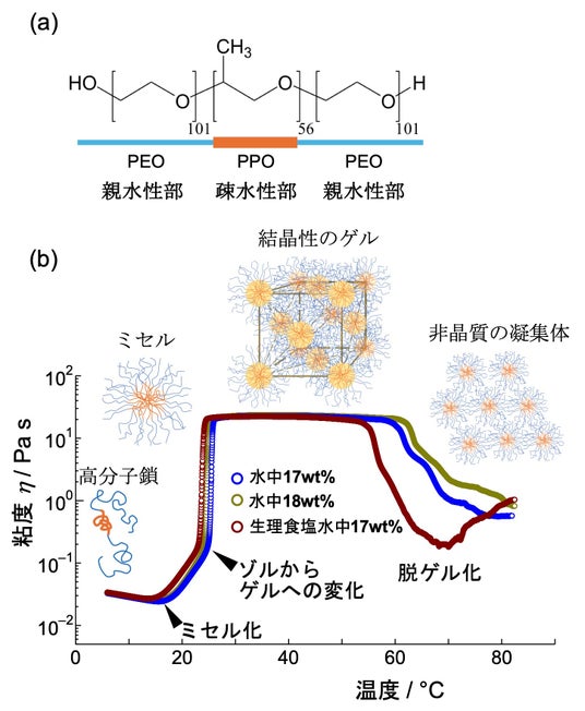 図1:(a) 重要なドラックナノキャリアであるポロキサマー407の化学構造。三つの部分から構成され、両端に生体親和性にも優れた親水性部分、中央に疎水性部分を持つ。(b) 温度の上昇にともなうミセル化、ゲル化、および、ゲルの構造が崩壊する脱ゲル化の挙動。親水性・疎水性部分の色分けは(a)の図と対応。