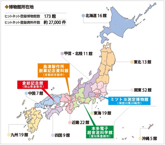ヒットネットに登録している産業系博物館は地方自治体が運営するもの、企業、学校、各種団体が運営するものなど様々な形態があります。現在、ヒットネットの登録博物館数は173館、登録資料件数は約27,000件です。