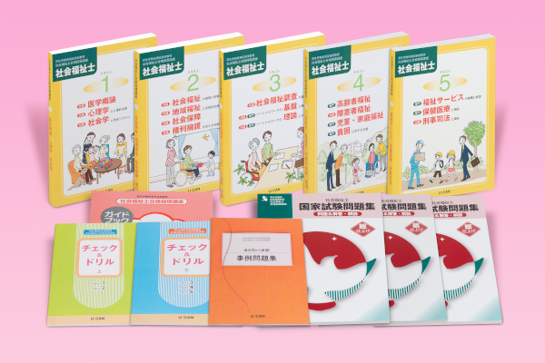 メインテキスト:5冊、副教材:チェック&ドリル2冊、過去問から厳選!事例問題集、社会福祉士国家試験問題集(3年分)、ガイドブック、その他(添削・質問関係書類など)