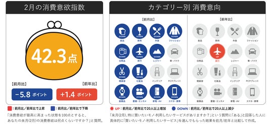 2月の消費意欲指数は、例年通り前月比大幅減も前年比微増。衣・食を中心に、ほとんどのカテゴリーで前月より消費意向低下