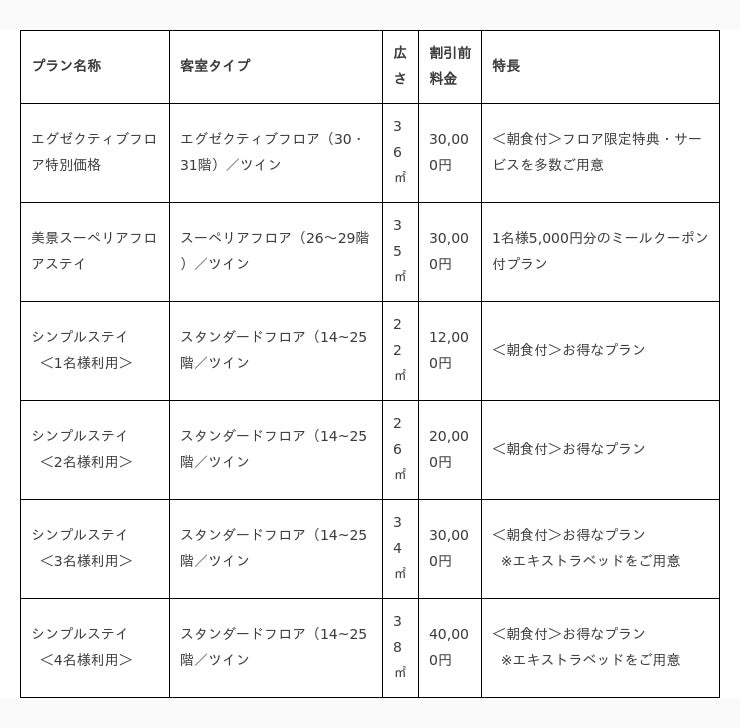 高層階からの絶景が広がる客室で行なうチェックイン(インルームチェックイン)や最上階レストランでの特別朝食など、さまざまなフロア限定の特典・サービスで、 “ホカンス” (ホテルとバカンスを合わせた造語)を楽しめる「エグゼクティブフロアステイ」(30・31階)や、和洋中の幅広いバリエーションを誇る館内レストランで利用可能な5,000円のミールクーポン付の「スーペリアフロアステイ」(26~29階)、そしてさまざまな部屋タイプを揃え、1~4名様まで利用可能な価格重視のお得なプラン「スタンダードフロアステイ」(14~25階)です。