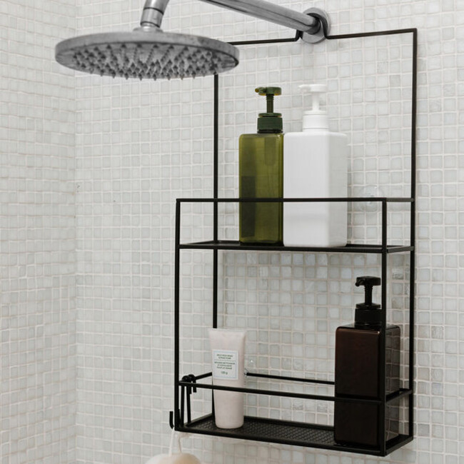 モンドリアンの絵画にインスパイアされた、アイアンフレームのシャワーキャディです。2段のトレイの棚板には穴が開いており通気性も抜群です。