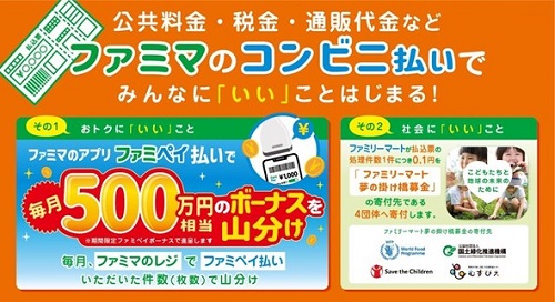 【内容】公共料金や通販代金などをファミペイ払いすると毎月500万円相当のボーナスを山分け!更に、払込票枚数に応じてこども達と地球の未来のためにファミリーマートが「ファミリーマート夢の掛け橋募金」の寄付先である4団体へ寄付を実施いたしました。