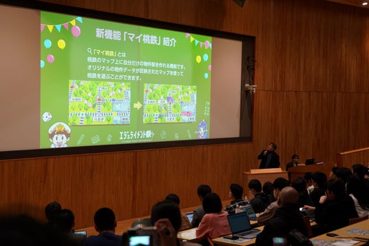 その後、 「桃太郎電鉄」シリーズの岡村憲明シニアプロデューサーが登壇し、フリースクールなどへの提供開始や「マイ桃鉄」の導入を発表しました。