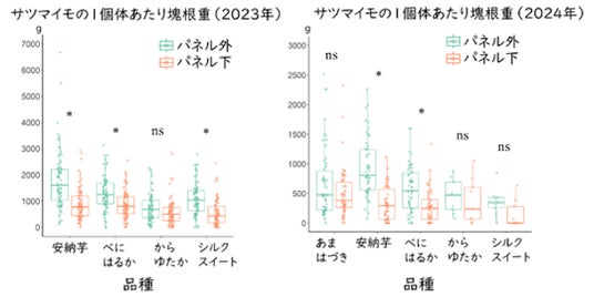 図3.有機栽培のサツマイモの収量をパネル外と下で品種ごとに比較 nsはパネル内外で有意差が無いことを、* は5%水準で有意であることを示す。