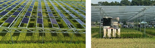 農業と再生可能エネルギーの生産はどちらも広い土地を必要とするため、土地利用を巡る軋轢が生じています。そこで注目されているのが、農地の上に太陽光パネルを設置して発電し、その下で農業を行う営農型太陽光発電です(図1)。土地利用効率が高く、農家の収益向上につながるとして近年アメリカやヨーロッパなどで注目されています。農林水産省によると、2022年度までに日本で累計約5,351件の営農型太陽光設備の農地の一時転用許可が出ており、設備の下部農地面積は約1,209haに達しています。これは農地の有効活用と再エネ導入の広がりを示しています。しかし、広く展開する上で課題となるのは「どの作物・どの品種を、どのように栽培すれば、パネルの下でも収量が維持できるのか」という点です。特に、日本の農地の大部分を占めるコメ・ダイズ・イモ類などを対象にした研究は少なく、また作物の種類や品種、栽培方法による違いを比較する研究はありませんでした。