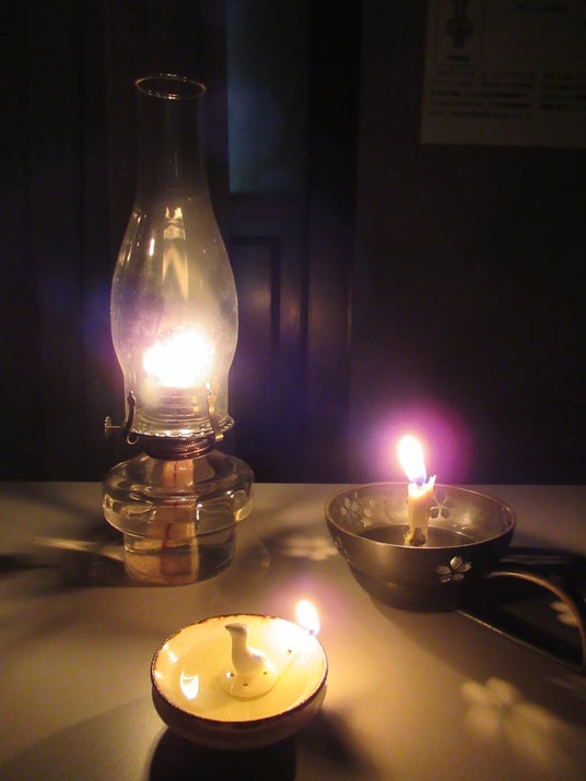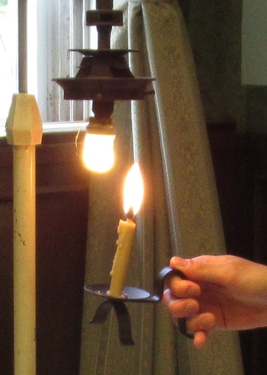 卓上のガスマントル灯にろうそくであかりを灯す体験ができます。