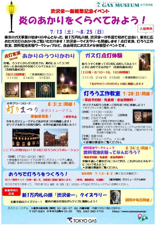 ガスミュージアムでは、2024年7月13日(土)から8月25日(日)まで、渋沢栄一新札記念イベント「炎のあかりをくらべてみよう!」を開催します。