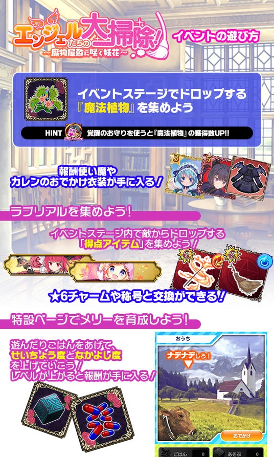 イベントで入手できるアイテム「なぞのかぷせる」と「きゅーぶのおもちゃ」を特設ページで使用したり、「メリー」をナデナデすることで、交流を深めることができます。「メリー」と交流を深めることでコラボ特別チャームなど様々な報酬を獲得できます。