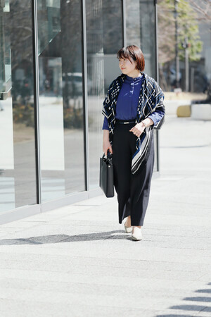 休日ラフに着ていたシャツをオフィス仕様に着回すなら、ネイビーのアイテムで周りを固めて知的に。ブルーのトップスで着映えつつ、比翼のデザインがきちんと感を演出します。ボトムスにセンタープレスの効いたパンツを合わせれば、スタイリッシュ度がさらにUP。温度調節できる便利な正方形ストールも、幾何学柄が服にマッチし、待ち合わせの目印にも役立ちそう。