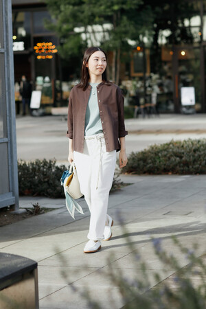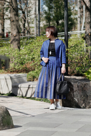きれいな色味のブルーをセットアップでコーディネート。気温の高い日は、シャツのボタンを開けた爽やかな休日スタイルに。インナーとバッグはブラックを選んで引き締めて。太陽を浴びてきらきらと輝くペンダントは、立体的にデザインされたシェルならでは。足元はスニーカーを選んで、暖かな陽気をフットワーク軽く楽しんで。