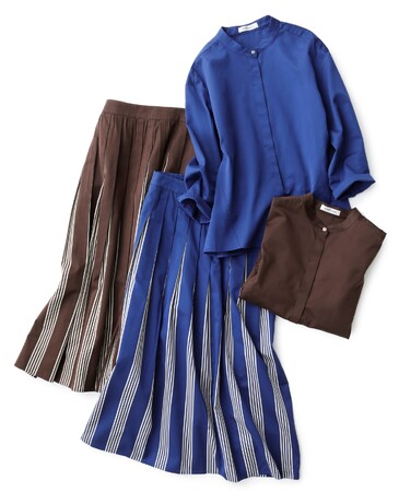 深みのあるカラーで仕上げた前開きシャツとタックスカート。コットンとキュプラを使用した、光沢感が美しいラチネ素材で、タテ糸を黒にすることで生地の色に深みを出し、落ち着きのある面持ちに仕上げました。トップスは、すっきりとした印象で仕上げたスタンドカラー。スカートは、爽やかなストライプ柄が目を惹くデザイン。セットアップではもちろん、単品でも着回しやすいアイテムです。