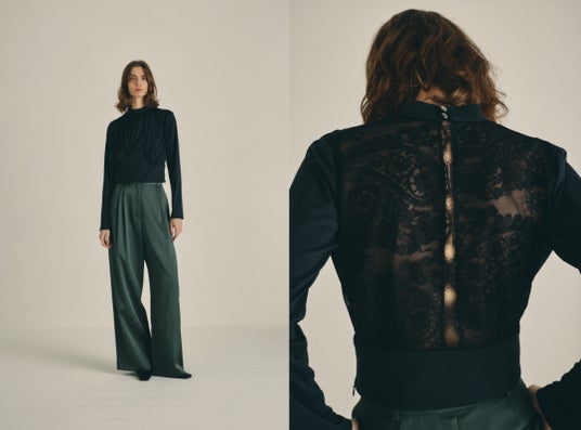 適度なハリ感としなやかさ、ストレッチ性を兼ね備えた艶感が特徴のレーヨンポンチ生地を使用した、ドレープデザインのトップス。なんと言っても印象的なのは、背面のオーガンジーから透ける繊細でセンシュアルなレースデザイン。メリハリのあるシルエットで女性のボディラインを美しく見せ、特別なシーンをよりドラマチックに、より贅沢な時間に演出する1着です。