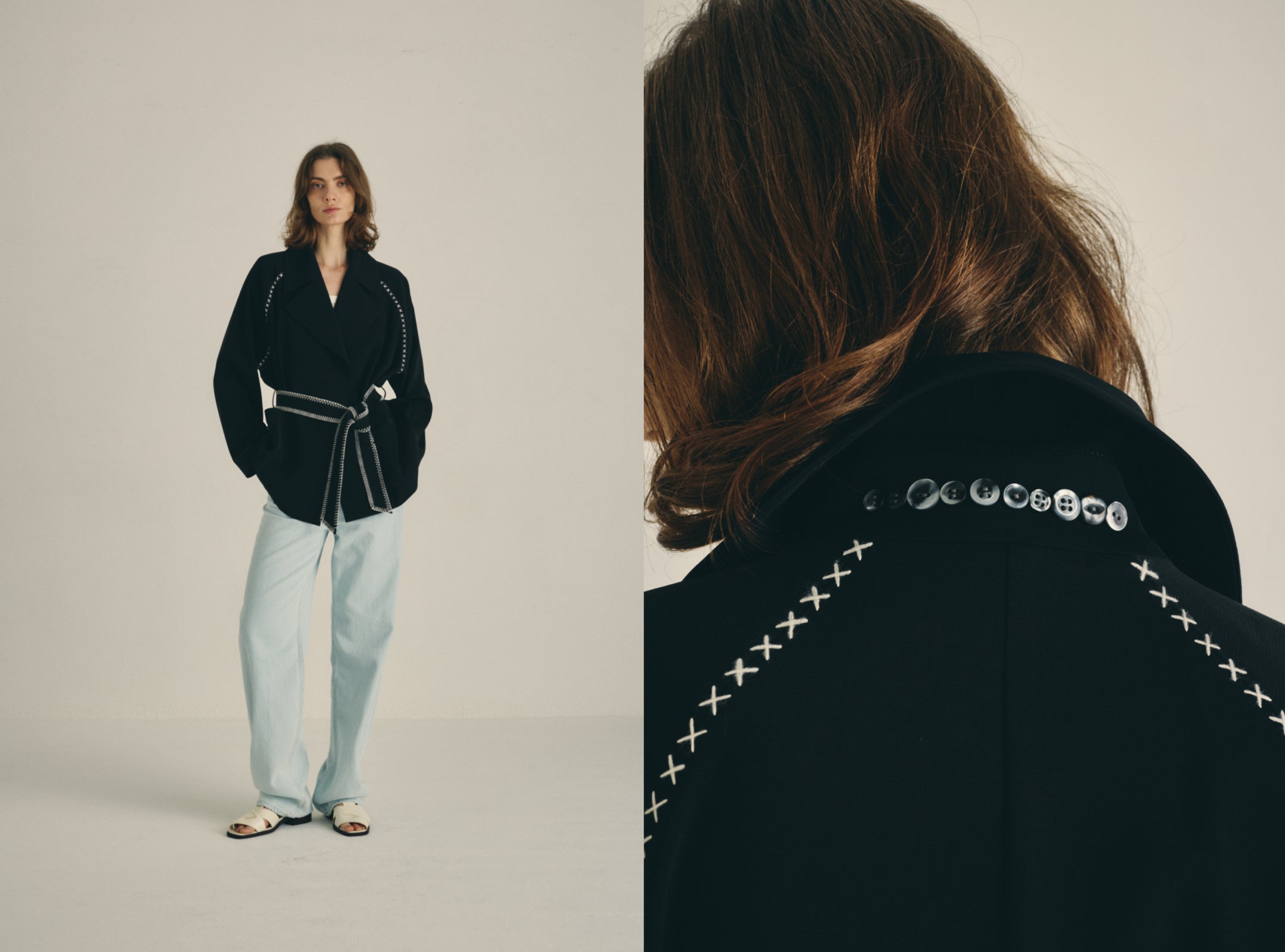 バランスを整えた服の中に、目には見えないこだわりや、わずかな違和感をデザインで創り、視線を自然と細部へと導きます。ディテールは全体を補足するためのものではなく、全体の印象を揺らす存在として配置されています。