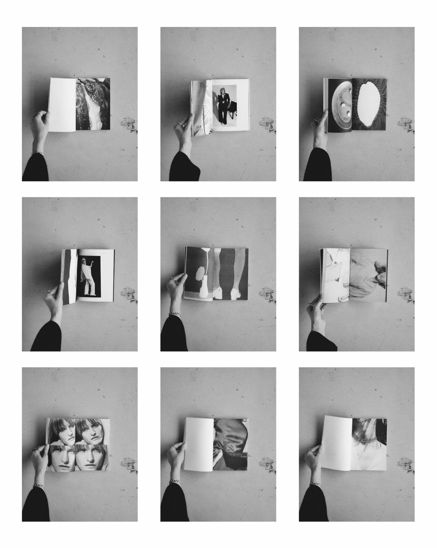 ある方向からページをめくると、最初に現れるのは拡大された素材や縫製、身体の断片などの細部です。全体像は意図的に伏せられ、ディテールそのものが独立したイメージとして提示されます。