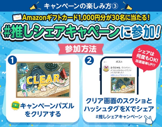 また、期間中には「#推しシェアキャンペーン」を実施。お気に入りの作品をSNSでシェアすると、抽選でAmazonギフトカード1000円分が当たるチャンスも!