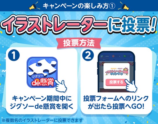 この機会に、ジグソーde懸賞でイラストレーターの作品の数々を1ピース、1ピース組み立てながらパズルをお愉しみいただき、ぜひユーザー投票やSNSでの推しシェアキャンペーンに参加していただければと思います。