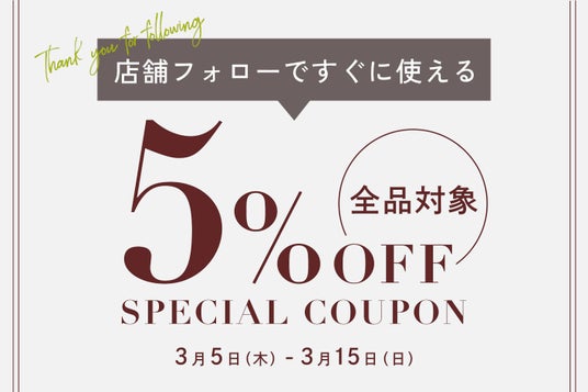 3月5日(木)~3月15日(日)の期間限定で、その場で使える5%OFFクーポンをプレゼントいたします。
