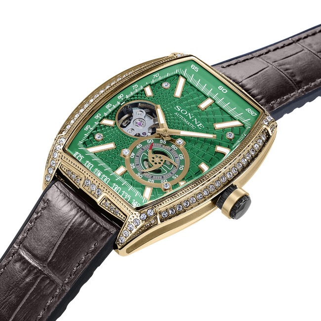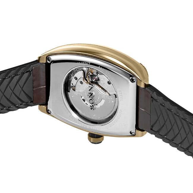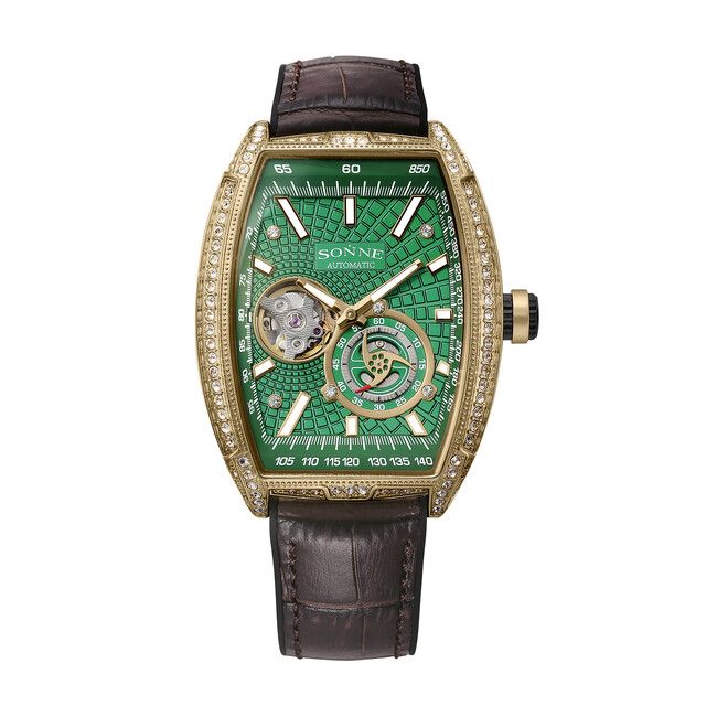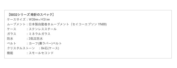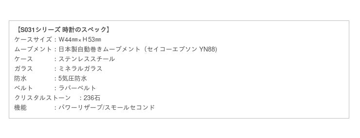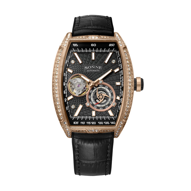 「SONNE(ゾンネ)」のS032コレクションは、S031コレクション同様に、日本製自動巻ムーブメントを使用し、オープンハートの小窓とスケルトンの裏蓋から駆動を堪能できます。ケースはエレガントなトノー型となります。