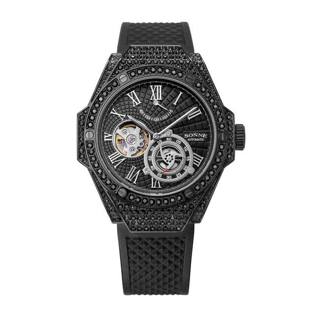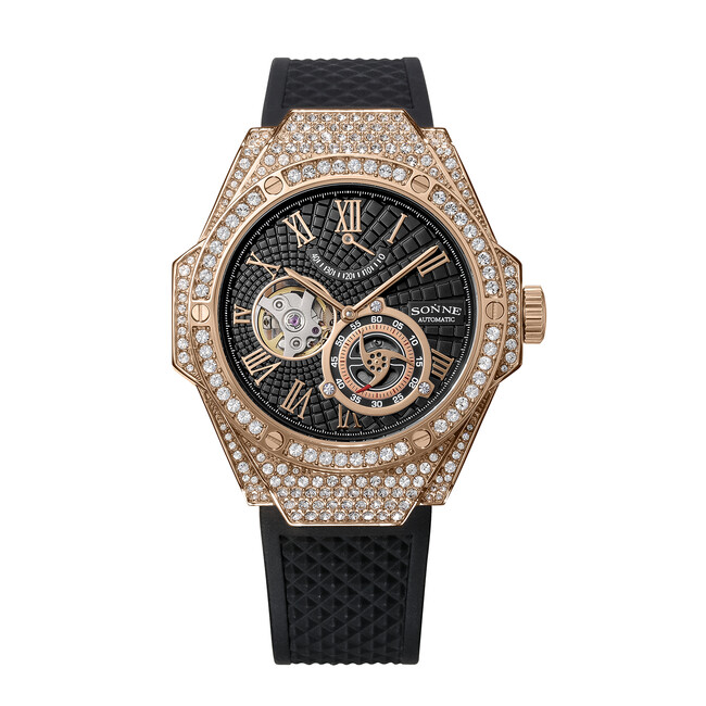 「SONNE(ゾンネ)」のS031コレクションでは、日本製自動巻ムーブメントを使用し、オープンハートの小窓とスケルトンの裏蓋から駆動を堪能できます。動力源の心臓部「テンプ」を「太陽」に見立て、オープンハートから放射線状に広がるギョーシェが解放感を齎す時計です。ケースにはゾンネ史上最多の236石のクリスタルガラスを配置。フェイスのローマ数字と相まって豪華ながらも、上品な印象を与えます。