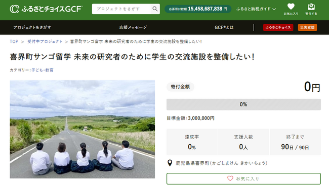 鹿児島県喜界町(町長:隈崎 悦男、以下「喜界町」)と国内最大級のふるさと納税総合サイト「ふるさとチョイス」( https://www.furusato-tax.jp/ )を企画・運営する、株式会社トラストバンク(本社:東京都渋谷区、代表取締役:川村憲一、以下「トラストバンク」)は、10月20日トラストバンクが提供する、ふるさと納税制度を通じてクラウドファンディング型で寄付を募る仕組み「ガバメントクラウドファンディング(R)」(以下「GCF(R)」)で、サンゴ留学の交流施設整備を目的としたプロジェクトを開始します。募集期間は2023年10月20日~2024年1月17日で、目標寄付金額は300万円です。