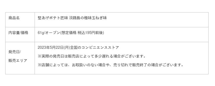 カルビー株式会社(本社:東京都千代田区、代表取締役社長: 江原 信)は、“噛むほどうまい!”堅い食感が人気のポテトチップス「堅あげポテト」から、少し贅沢な和の味わいを追求した「匠味」シリーズの『堅あげポテト匠味(たくみ) 淡路島の極味(きわみ)玉ねぎ味』を2023年5月22日(月)から全国のコンビニエンスストア限定で発売します。