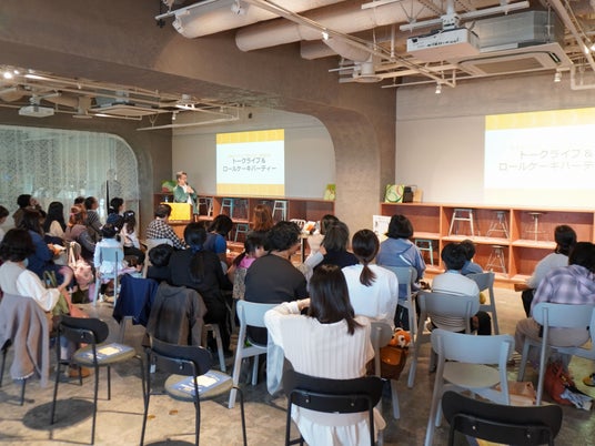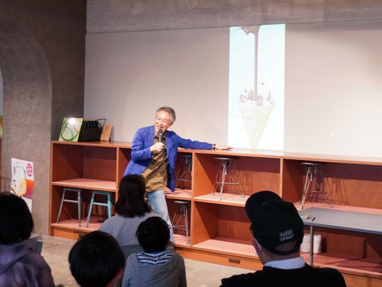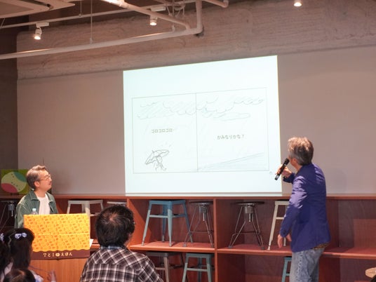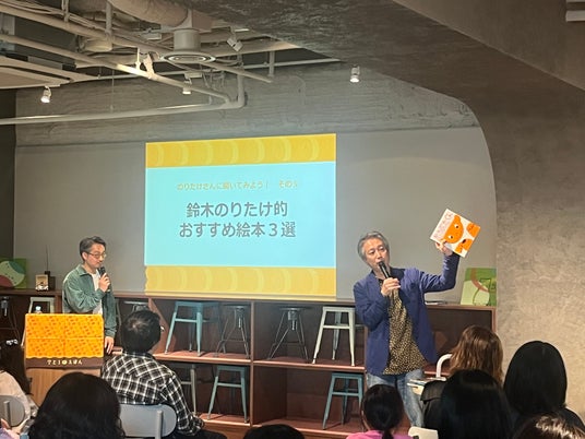 「絵本を100倍楽しむ方法」というトークテーマでは、のりたけさんが実際にお子さんと楽しんでいる手作りのカードゲームや、名前付け遊びなどがクイズ形式で紹介され、のりたけさんが日々の子育てを楽しんでいる様子や、絵本のアイデアの源泉に触れることができました。