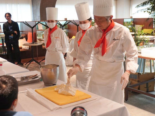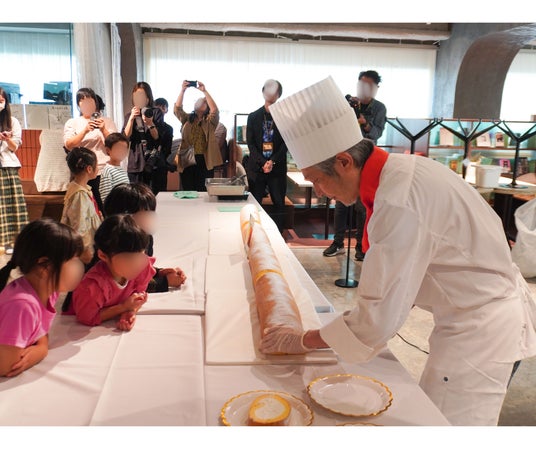 株式会社モンシェールのパティシエさんのお手伝いのもと、鈴木のりたけさんが巻いた超ロング「堂島ロール」が完成!