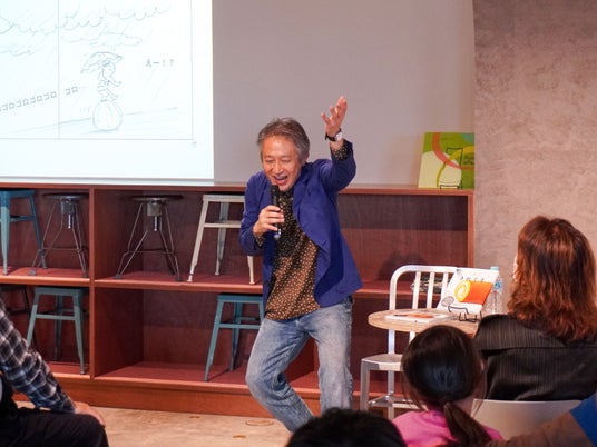 のりたけさん自身による、新作『きれてる』とシリーズ第1弾の前作『たれてる』の、サービス精神満載な読み聞かせも行われ、会場はさらに大盛り上がり。大人も子供も一緒になって、何度も笑いが巻き起こります。