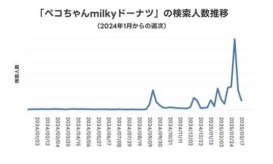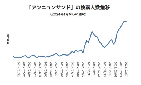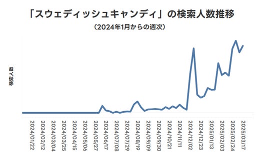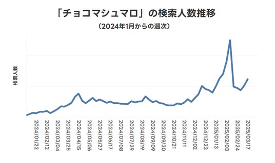 図中には表れていませんが、2024年に「ハリボー チョコマシュマロ」という検索キーワードでブームが起こっていました。この時は特定の商品への人気が集中していましたが、その後さまざまな企業から「チョコマシュマロ」商品が発売され始め、ジャンルとしてのブームの兆しが出てきています。なお2025年に大きく伸びているのは、バレンタインデーの影響によるものと考えられます。