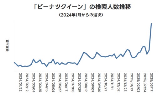 「ピーナツクイーン」とは、千葉県産のピーナッツを使用した高級感のあるフロランタン菓子です。しっとりとしたバター風味の生地に、たっぷりのナッツを挟んだキャラメルヌガーが特徴で、ザクザクとした食感と豊かな香りが楽しめます。この商品を手掛ける「ピーナツファクトリー」がオープンした2022年より検索がじわじわと増え続け、2025年に入り大きな伸びを見せています。