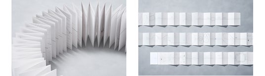 中面は、一般的な背開き型ではなく、1枚の紙を折りたたんだ蛇腹折り構造(アコーディオン型)を採用。これまでの人生経験が、すべて今の自分に繋がっていることを表現しています。また、各ページデザインには1本の線が描かれており、本を紐解く際に触った紐が最後のページまでずっと繋がるようにデザインをしています。