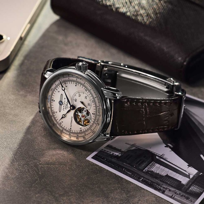 ヘッドのデザインのベースは、ドイツの歴史的飛行船の偉業を称える腕時計「ツェッペリン100周年記念シリーズ」。今回の7662シリーズは、7時位置のムーブメントの心臓部“テンプ”の動きを堪能できる「オープンハート」仕様。裏蓋もスケルトン仕様で、機械式時計ならではの趣のあるアナログ感を嗜めます。